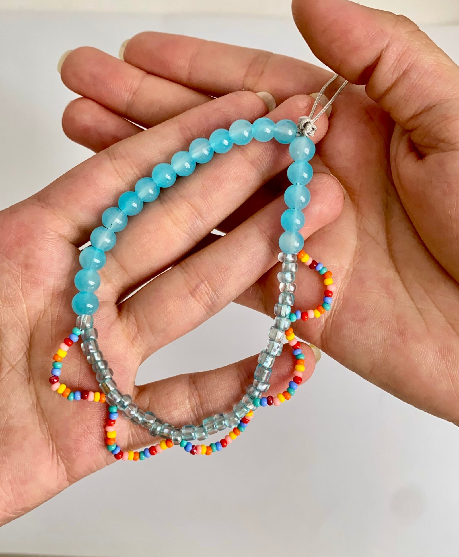 Hecho con chaquirón, piedras acrílicas e hilo celular gris.