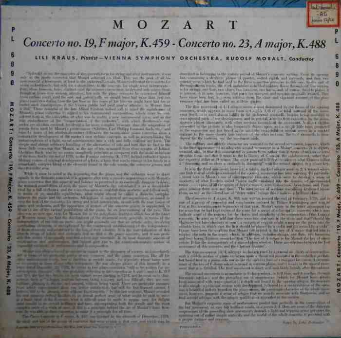 Mozart Piano Concertos Lili, Kraus, pianist Vienna Symphony Orchestra Rudolf Moralt, Conductor LP